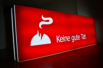 In seinem Projektbüro am Ostertor 12 zeigt Markus Gustav Brinkmann fünf Arbeiten unter dem Titel »Keine gute Tat«. Jede einzelne und alle zusammen sind das Angebot an die Bürger und Bürgerinnen, ihm Geld zu geben. Markus Gustav Brinkmann hat beobachtet, dass es der höchste Wert unserer Gesellschaft ist, möglichst viel Geld für möglichst wenig Gegenleistung zu bekommen. Artifiziell überspitzt Markus Gustav Brinkmann diesen Zustand, indem er die Gegenleistung auf Null setzt. Markus Gustav Brinkmann nimmt nur noch. Dafür ist ihm jede Begründung recht.